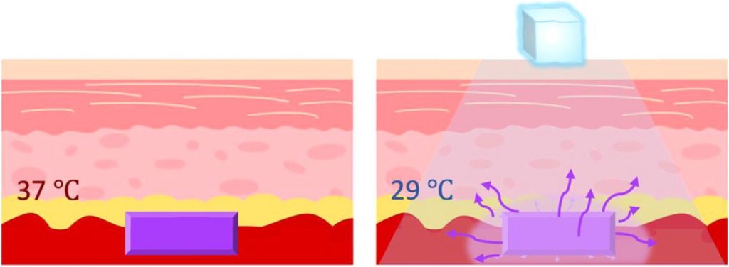 To address this issue, Bellan and his team have developed a drug delivery system that can be implanted and triggered by a local reduction in temperature, which can be accomplished by simply placing something like an ice pack over the external area where the device – about the size of a watch battery – is implanted. Once the cooling trigger is applied, a hydrogel, or sponge-like structure, liquifies and releases medication to the targeted area.