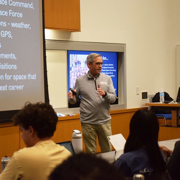 One recent speaker was Damon Feltman, Brigadier General, USAF (Ret.) and CEO of the Space Force Association (SFA). He is also a mentor in Space-Edge, a multi-institutional pre-accelerator educational program focused on the space economy. Feltman said he enjoys sharing his experiences with students.